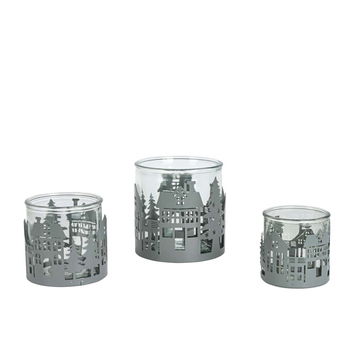 Atmospheric metal tealight holder with wintry village motif in gray – perfect for a magical play of light at Christmas