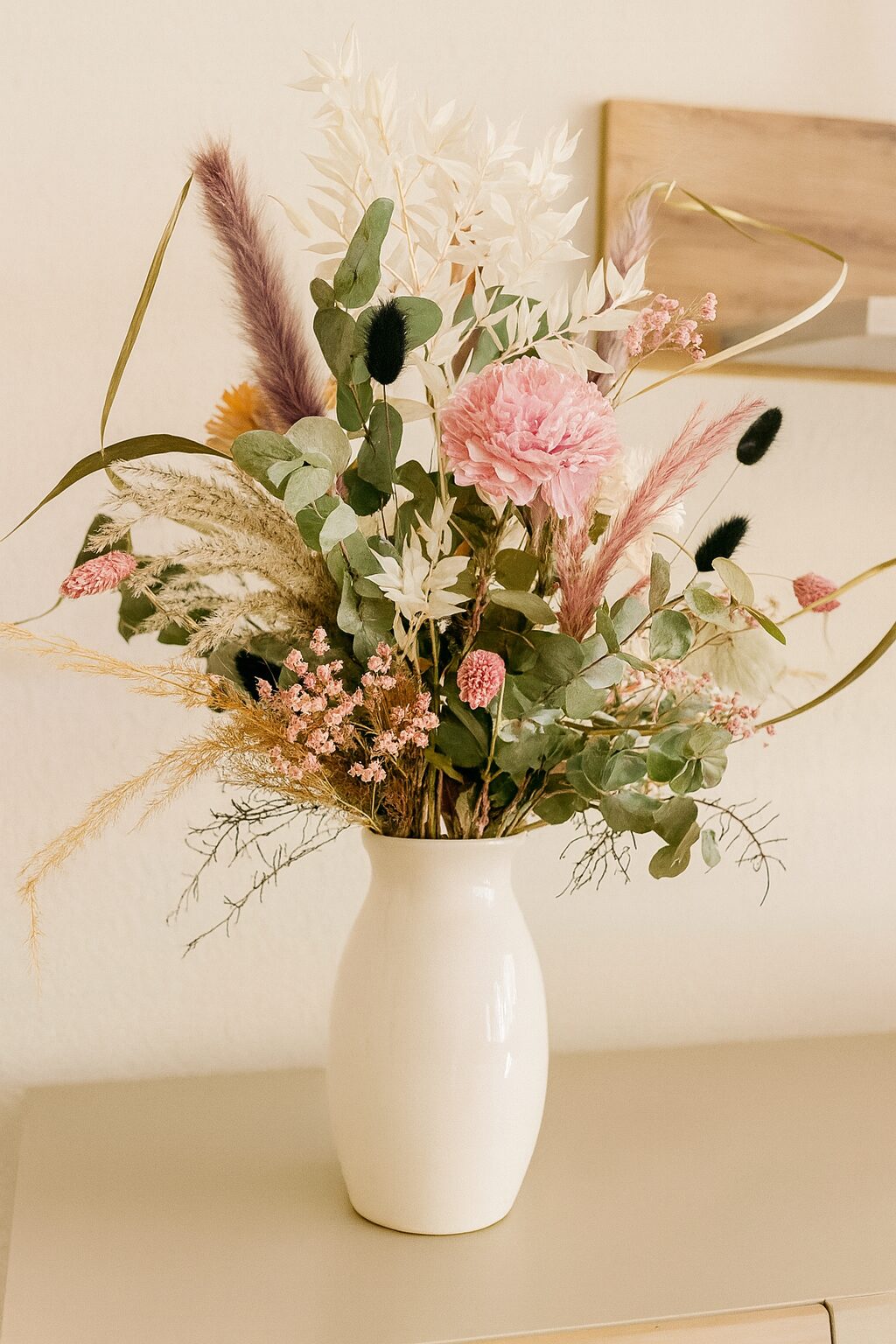 This beautiful bouquet is a perfect combination of artificial carnations, eucalyptus, lagurus, pampas grass and natural grasses. Each element has been carefully selected to create a harmonious and stylish design. The dried flowers are a great choice for those who want a long-lasting and low-maintenance decoration. Our bouquet will give you years of pleasure. You can display it in a vase or use it as a wall decoration to add a touch of elegance to your home. The bouquet is not only a great choice for your own home, but also a perfect gift for friends and family on various occasions such as birthdays, weddings or simply to show them how much you appreciate them.