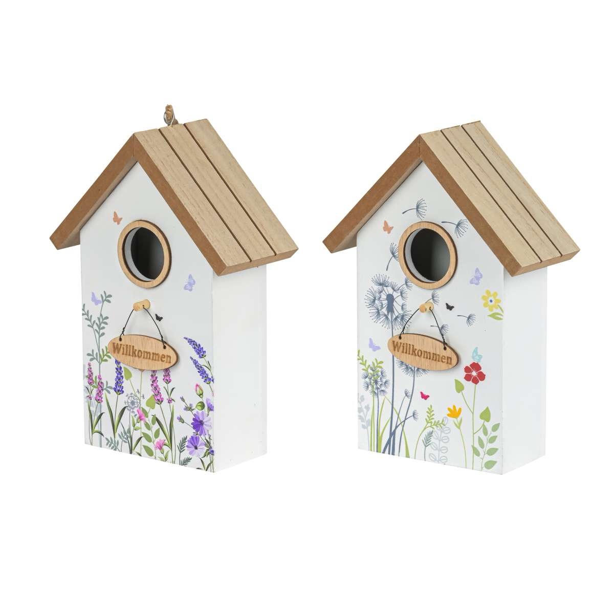 This decorative wooden bird house in white and natural is the ideal addition to your spring decorations. With a lovingly designed flower motif and available in two different models, it is perfect for the entrance area, garden or as a table decoration.