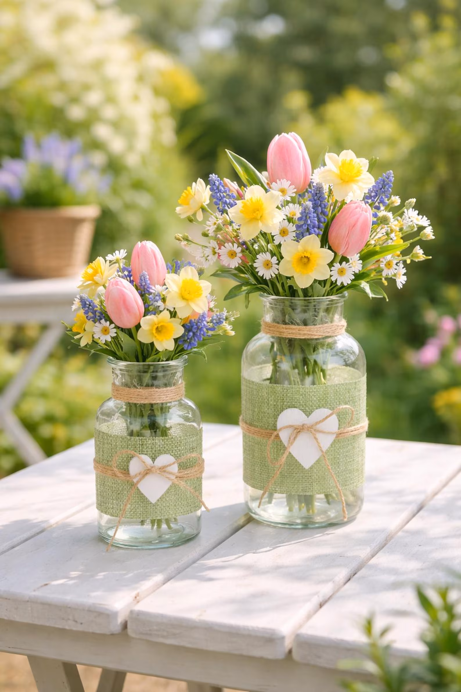 Natürliche Glasvase mit Jute & Herz im Landhausstil