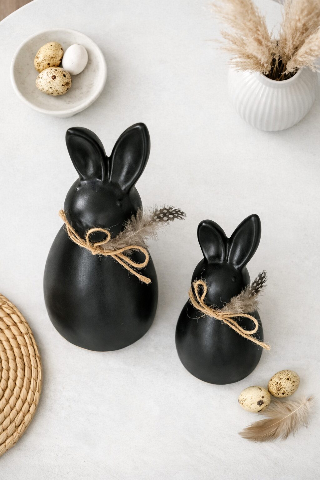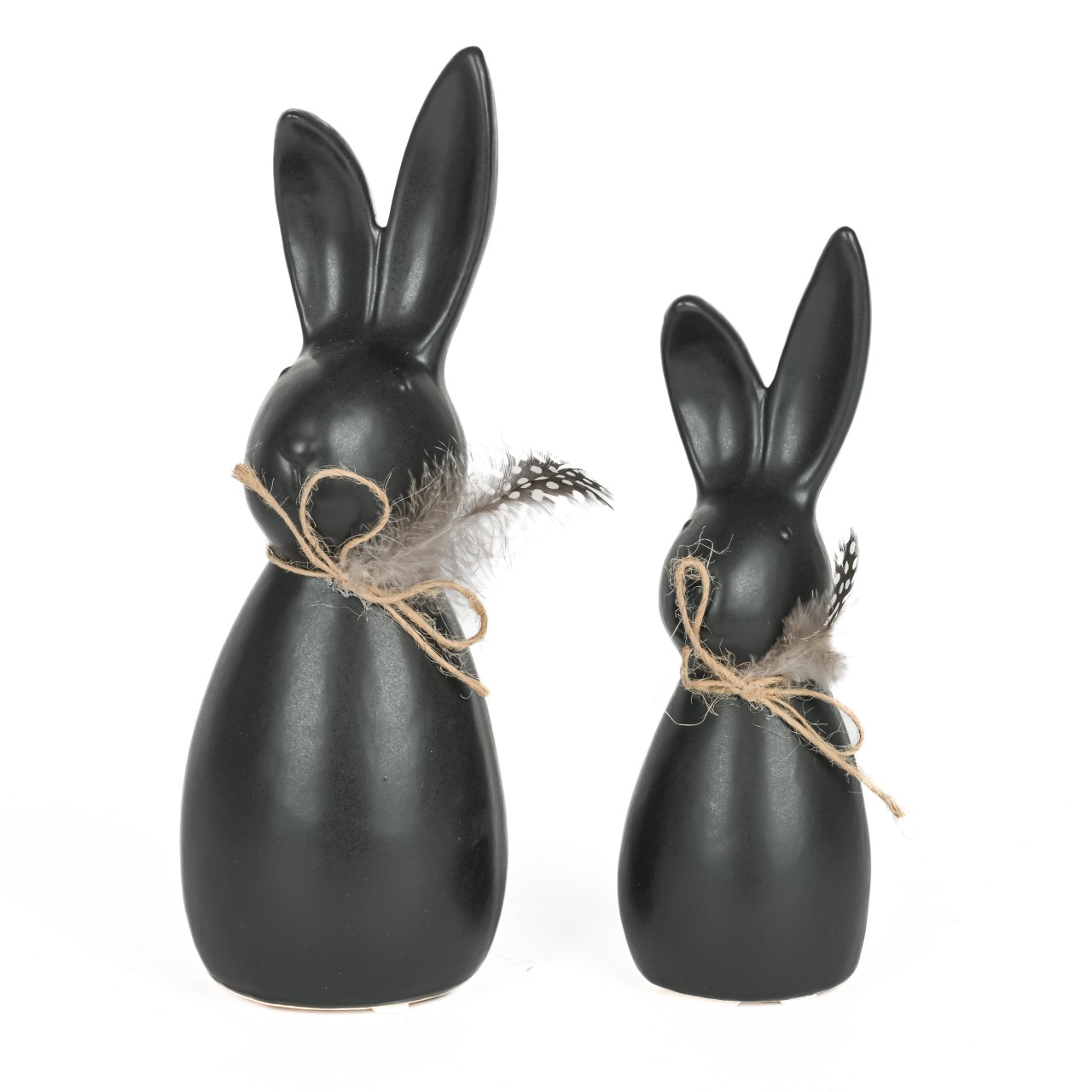 Dieser stilvolle Osterhase aus Keramik überzeugt durch sein modernes, minimalistisches Design. Die matte schwarze Oberfläche wird durch eine natürliche Juteschnur mit dekorativer Perlenfeder ergänzt und verleiht der Figur einen edlen, zeitlosen Charakter. Ideal für moderne Wohnräume, den Ostertisch oder als besonderes Geschenk zur Osterzeit.