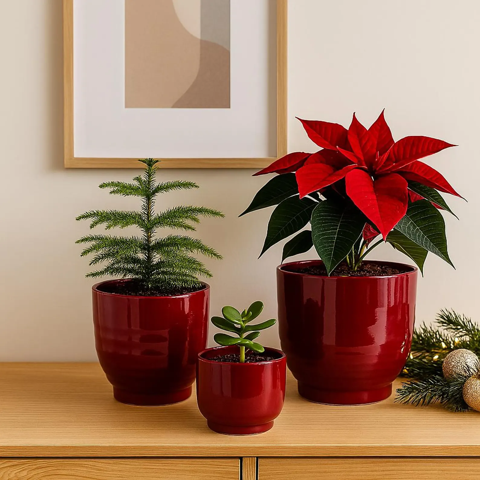 Diese glänzend roten Blumentöpfe bringen sofort weihnachtliche Stimmung in dein Zuhause! Ob als Übertopf für Weihnachtssterne, Amaryllis oder andere Winterpflanzen – diese Pflanztöpfe setzen deine Weihnachtsdeko stilvoll in Szene.