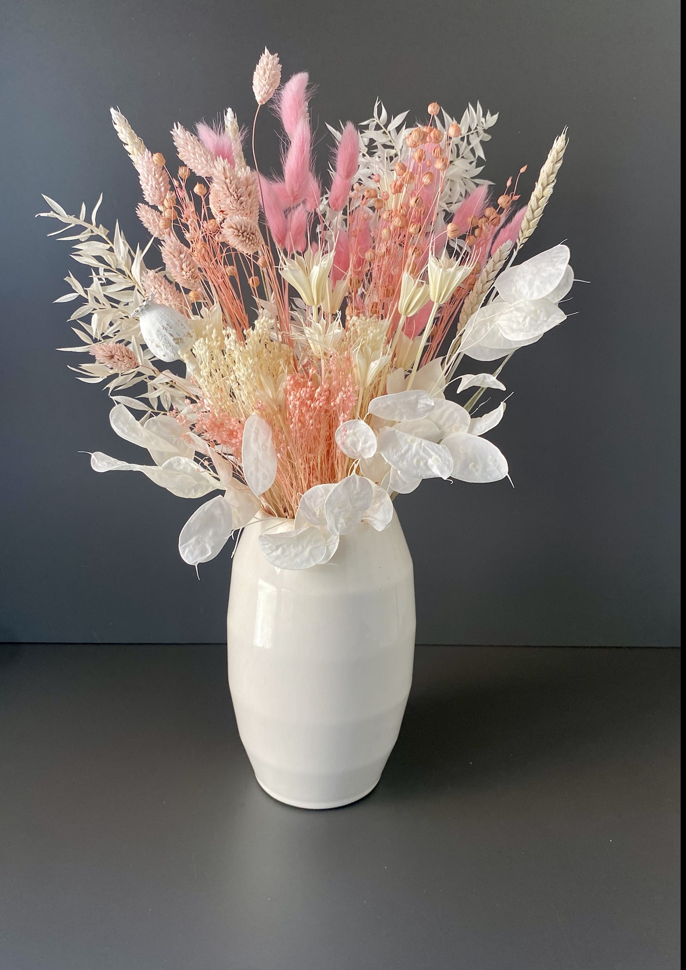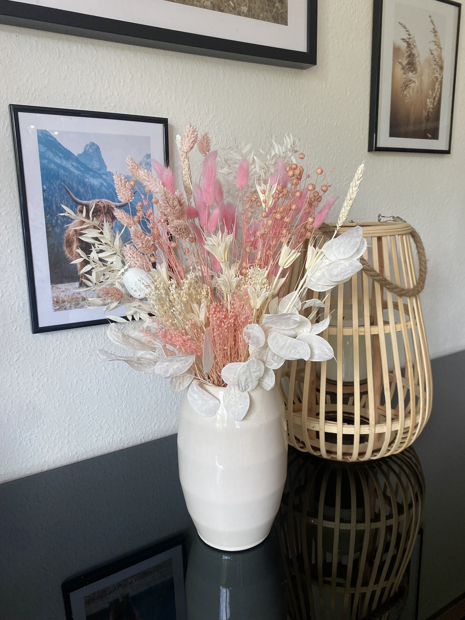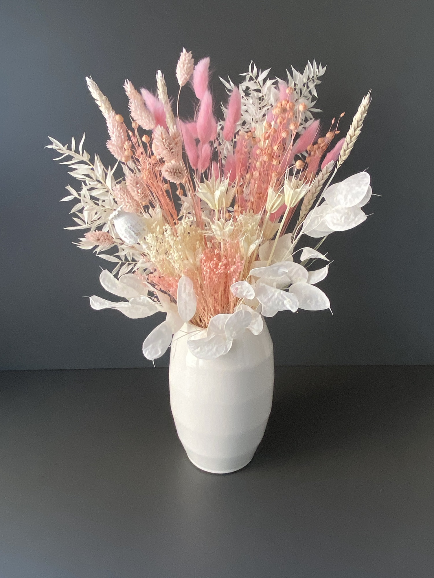 Die Kombination verschiedener Trockenblumen und Gräser macht den Trockenblumenstrauß zu einem Blickfang, der sofort ins Auge fällt. Jede Blüte und jedes Gras wurde sorgfältig ausgewählt, um ein harmonisches Gesamtbild zu schaffen. Die warmen Rosatöne geben dem Strauß eine romantische Note, die jedes Herz höher schlagen lässt.