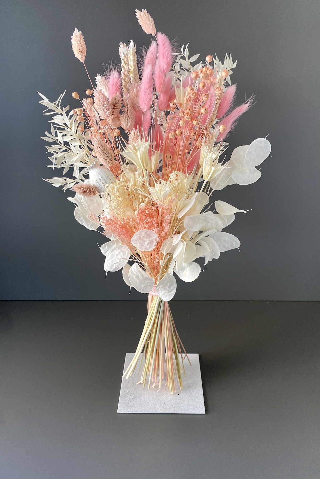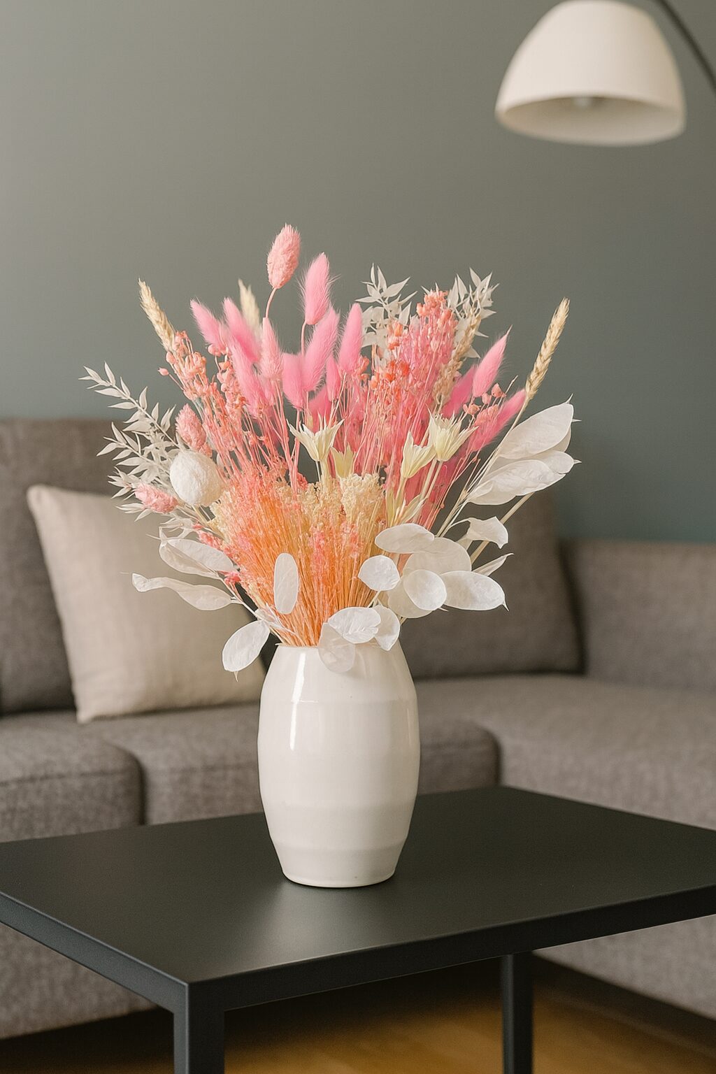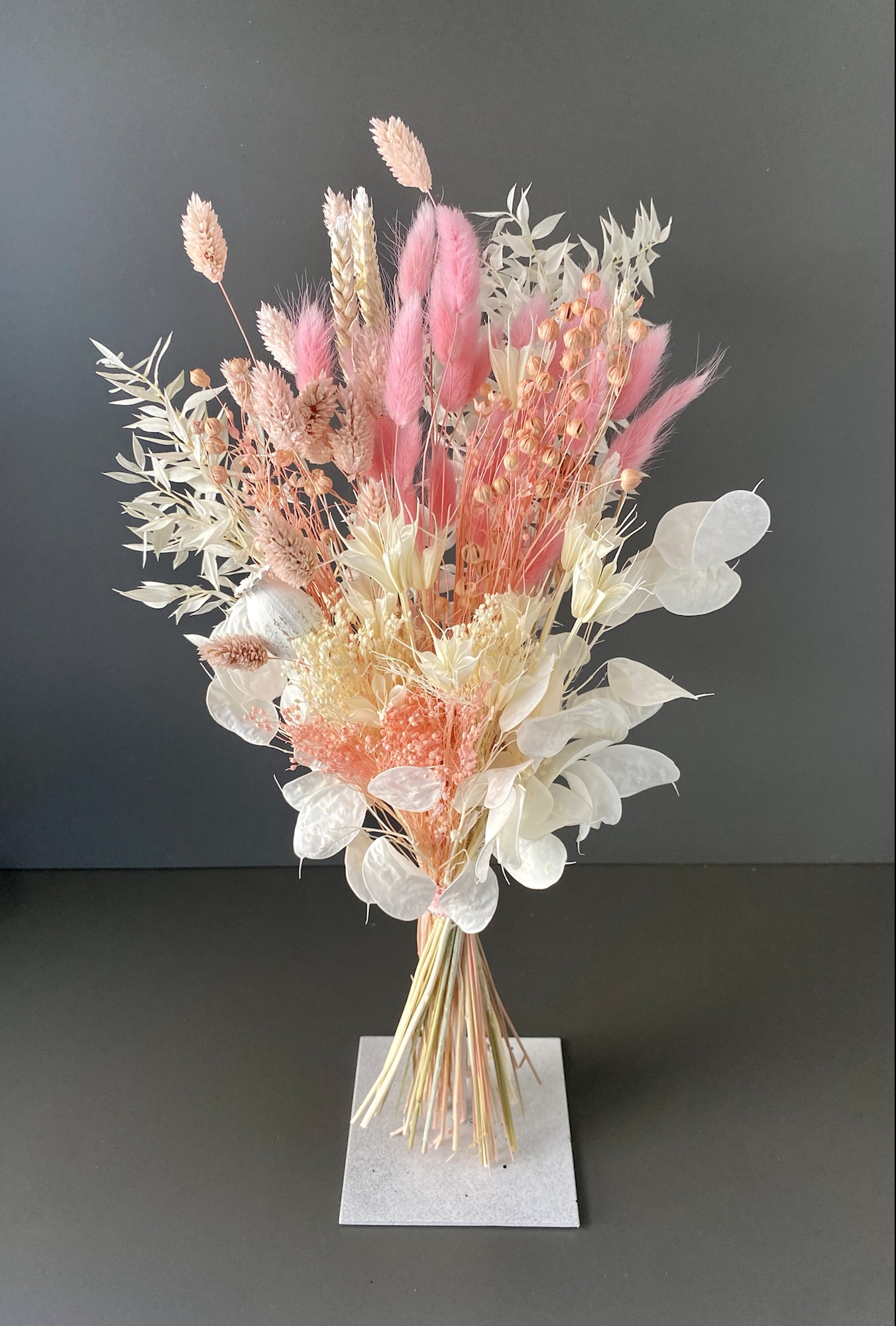 Die Kombination verschiedener Trockenblumen und Gräser macht den Trockenblumenstrauß zu einem Blickfang, der sofort ins Auge fällt. Jede Blüte und jedes Gras wurde sorgfältig ausgewählt, um ein harmonisches Gesamtbild zu schaffen. Die warmen Rosatöne geben dem Strauß eine romantische Note, die jedes Herz höher schlagen lässt.
